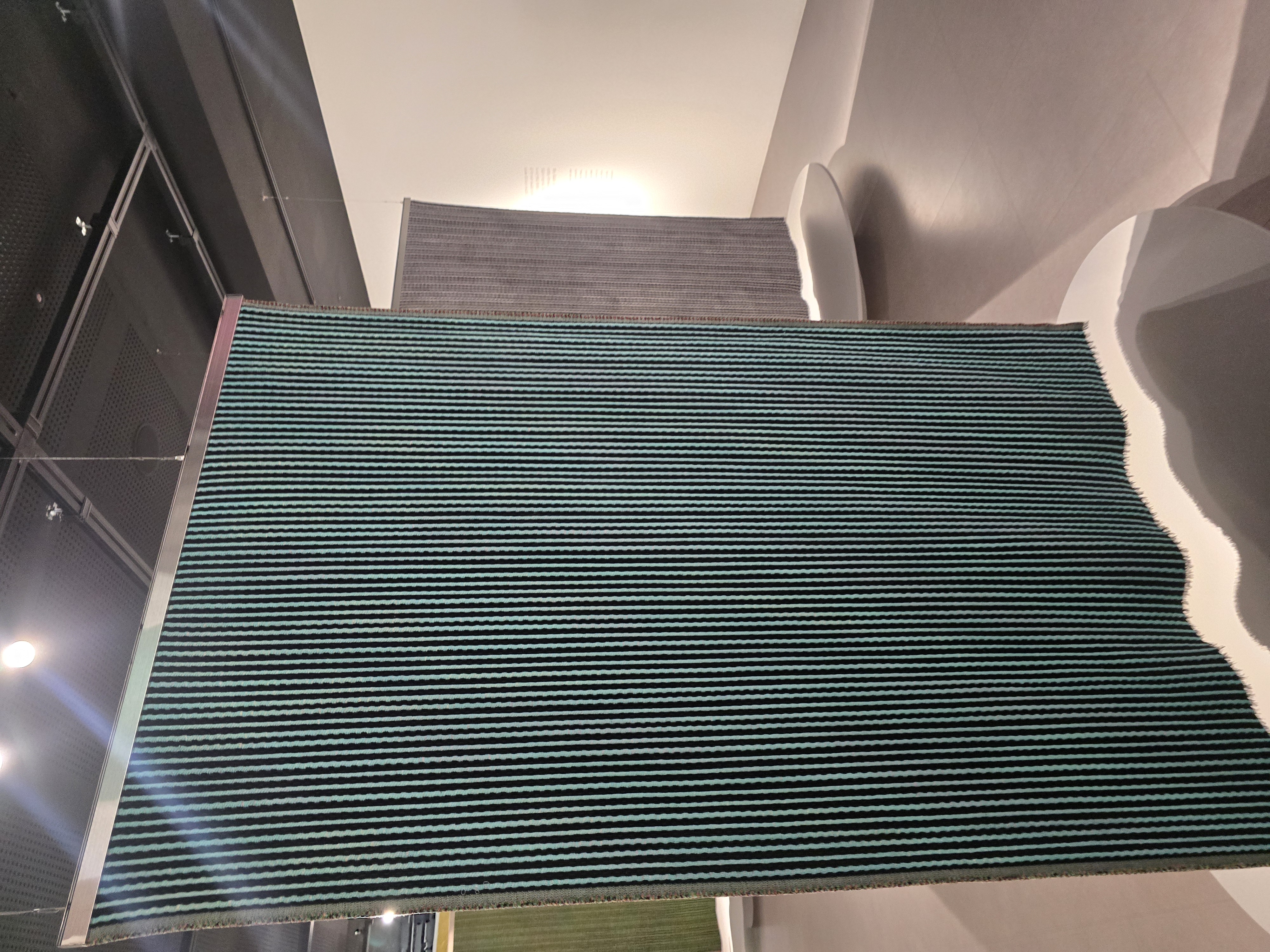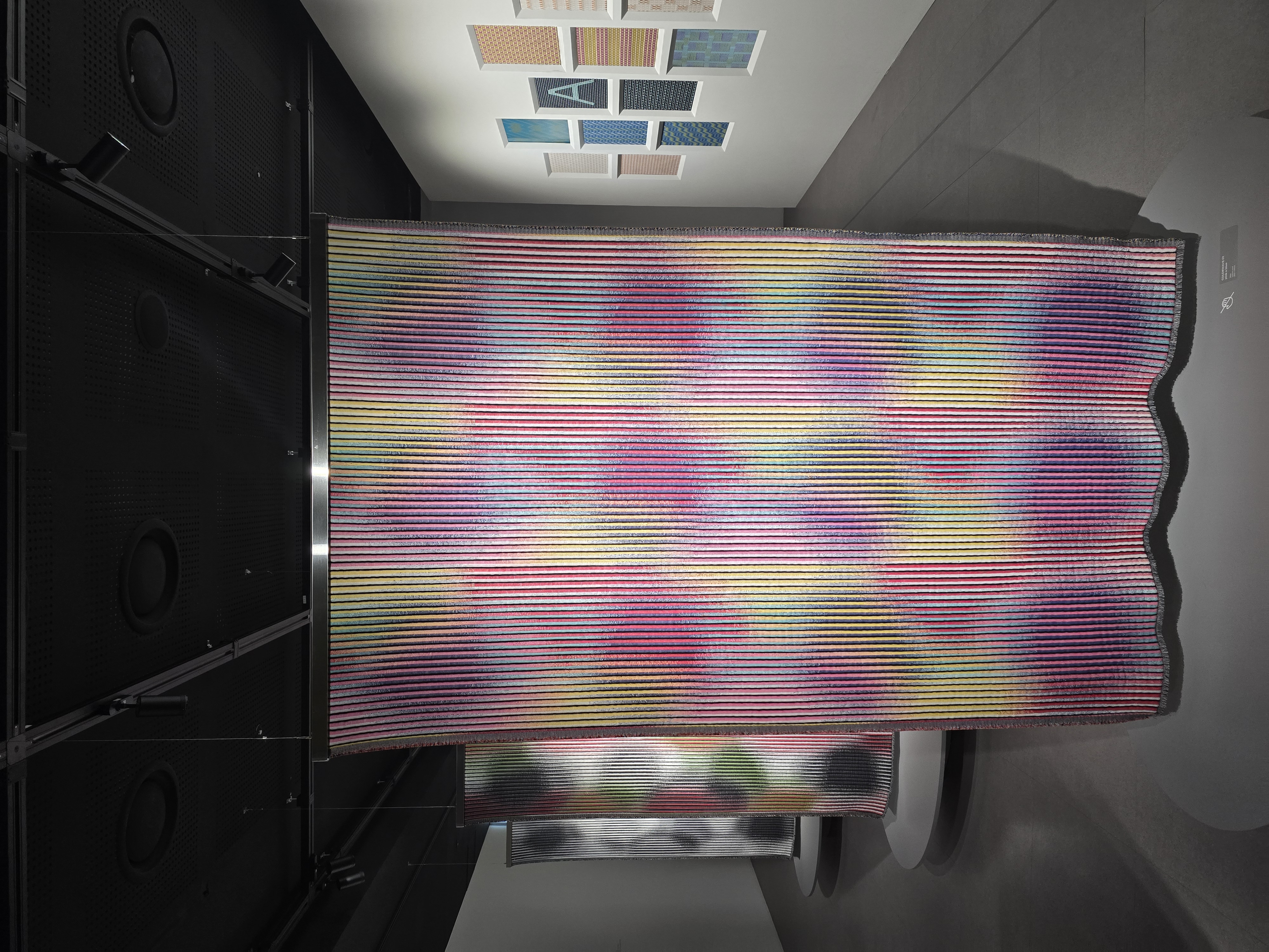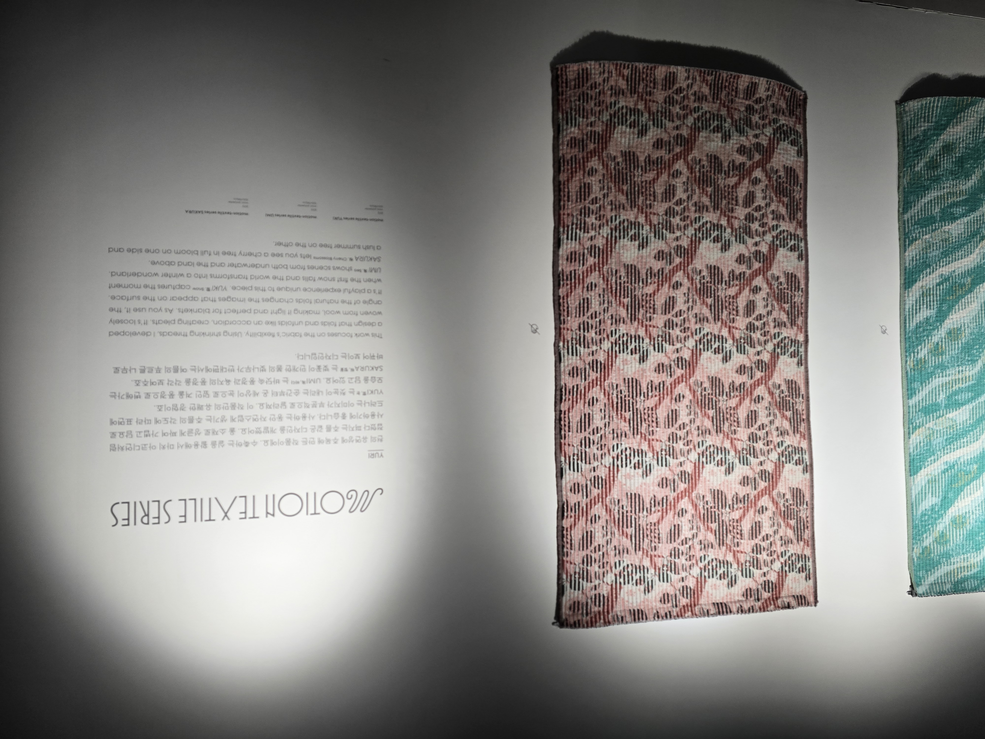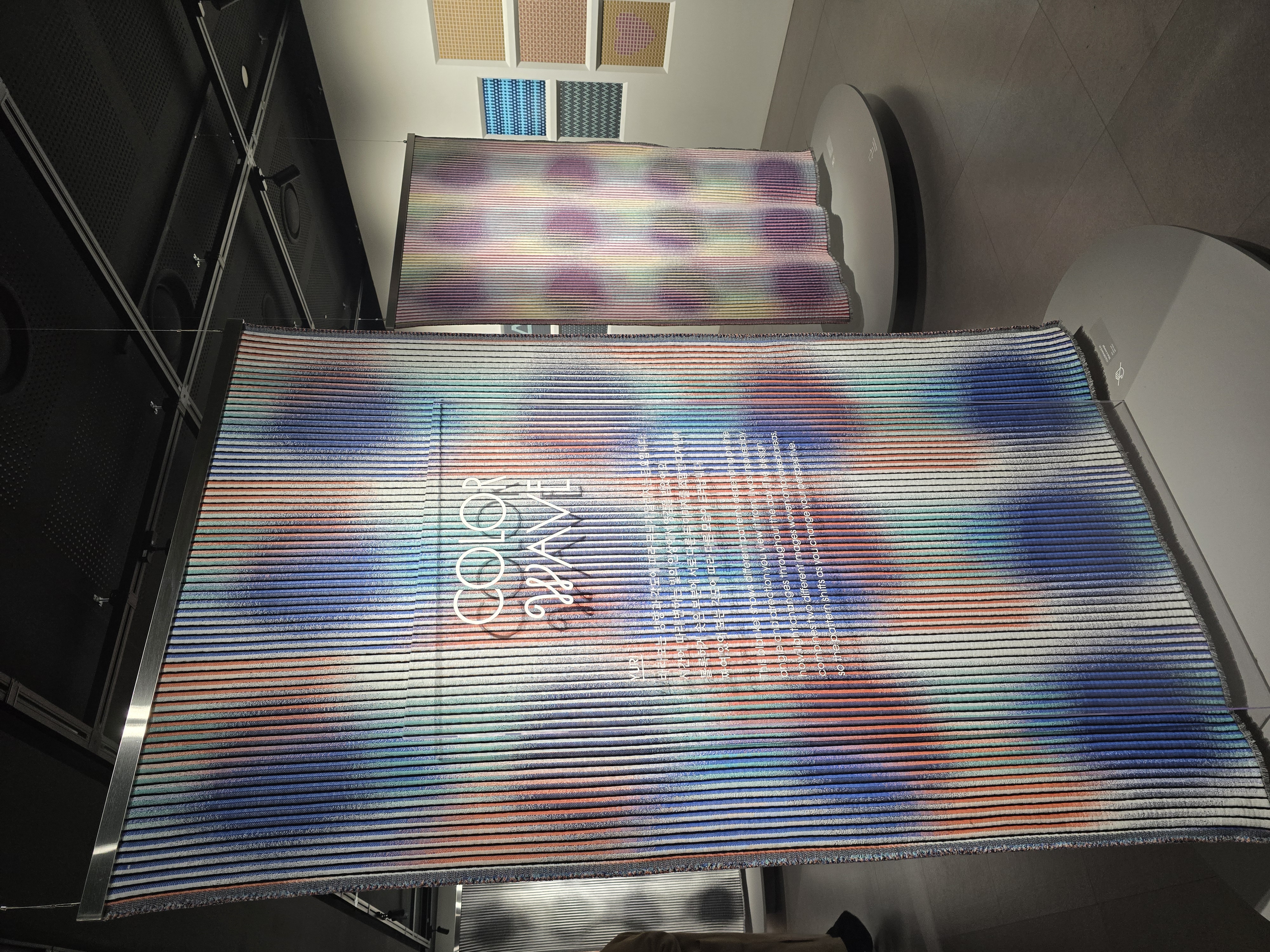 홀로그램이 천으로 구현이 가능한 기술이라는걸.. 오늘 처음 알았다, 홀로그램처럼 각 돌기가 좌/우 다른 면으로 칠해져 있어서 각도에 따라 작품이 다른 모습으로 보인다.