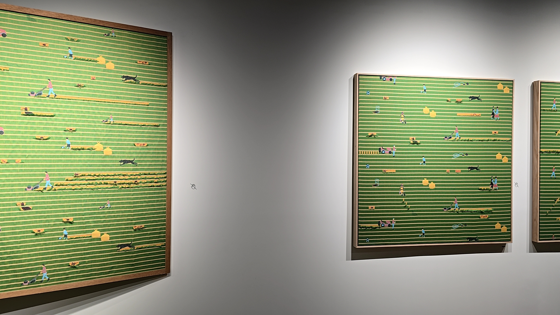 자세히보면, 정원사의 작업진도율이 다르기도하고 강아지가 뛰노는 들판 모양이 다르고 규칙 속에 차이가 반복된다.